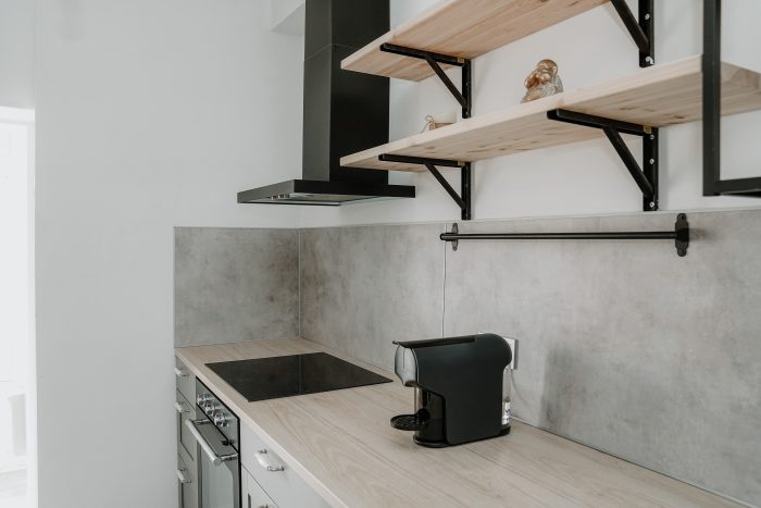 Fully equipped kitchen: induction hob, dishwasher, microwave, oven, coffee machine, fridge, kettle, toaster