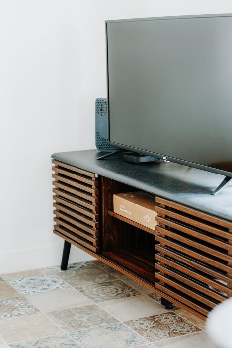 Living room with a sofa, Smart TV, table and chairs